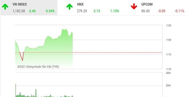 Chốt phiên sáng, sàn HOSE có 194 mã tăng và 228 mã giảm, VN-Index tăng 6,40 điểm (+0,54%), lên 1.182,08 điểm. Tổng khối lượng giao dịch đạt hơn 485,55 triệu đơn vị, giá trị 9.268,4 tỷ đồng, tăng gần 24% về khối lượng và 9% về giá trị so với phiên sáng hôm qua. Giao dịch thỏa thuận đóng góp hơn 35 triệu đơn vị, giá trị 840,8 tỷ đồng.